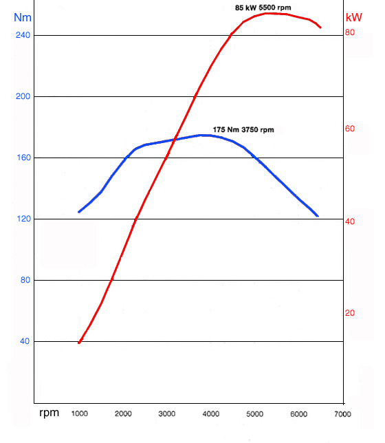Sigamos observando la gráfica. Ahora centrémonos en la raya roja, que representa la potencia. He preferido esperar a la última parte del artículo porque es una magnitud más conocida y que está directamente relacionada con el par. A grandes rasgos, no es otra cosa que la relación matemática entre el par y las revoluciones. Así que si multiplicamos ambas cifras, obtendremos la potencia que desarrolla el motor en función del régimen de giro. Y aquí viene uno de los grandes errores que solemos cometer. Conozco a mucha gente que, circulando a 1.500 rpm., se quejan de que su coche no tiene potencia suficiente. Si la motorización de nuestro vehículo es capaz de desarrollar 115 CV, a ese rango de revoluciones tan sólo está en 80 CV.