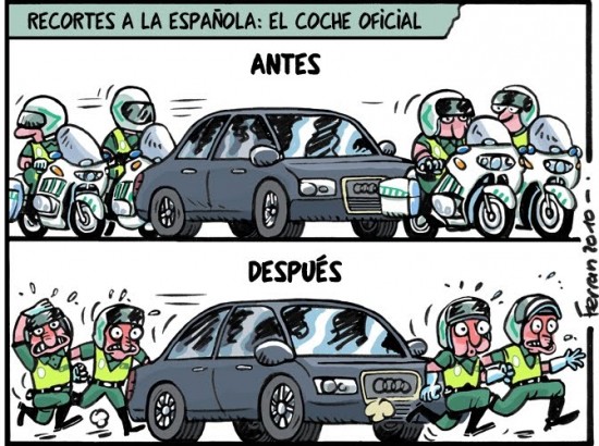 Me parece que, una vez más, el recorte es poco valiente, ya que de 307 unidades actuales se va a pasar a 103. No está mal para la Administración Central. Sin embargo, todos sabemos que el gran despilfarro se encuentra en las Comunidades Autónomas y Ayuntamientos. Si el Gobierno tuviese verdadera voluntad, podría promulgar una norma que estableciese los criterios básicos a la hora de utilizar un vehículo oficial en cualquier administración pública, que deberían ser muy similares a los que he expuesto en la entradilla.