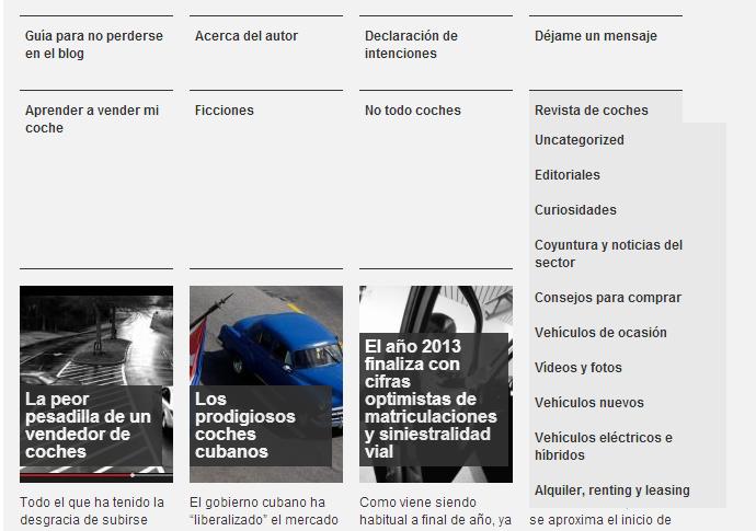 - Revista de coches: en este apartado he agrupado las anteriores categorías en las que estaba dividido Wanderer75. Si pasamos el ratón por encima, se despliega un menú con las siguientes fichas: «Uncategorized», «Editoriales», «Curiosidades», «Coyuntura y noticias del sector», «Consejos para comprar», «Vehículos de ocasión», «Vídeos y fotos», «Vehículos nuevos», «Vehículos eléctricos e híbridos», y «Alquiler, renting y leasing».