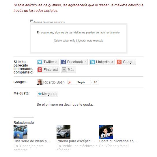Al final de la entrada, y siempre que el lector no se haya registrado en WordPress, aparece un pequeño banner publicitario y debajo encontramos el cajetín para difundir el post en las redes sociales. Pinchando en los diferentes iconos podemos difundir el artículo en las siguientes redes sociales: Twitter, Facebook, Linkedin, Google Plus, Pinterest, Digg, Redit, Tumblr, StumbleUpon y Pocket. Además, también existe un widget para imprimir el artículo si queremos leerlo en papel o guardarlo en un PDF. También podemos mandarlo por correo electrónico.